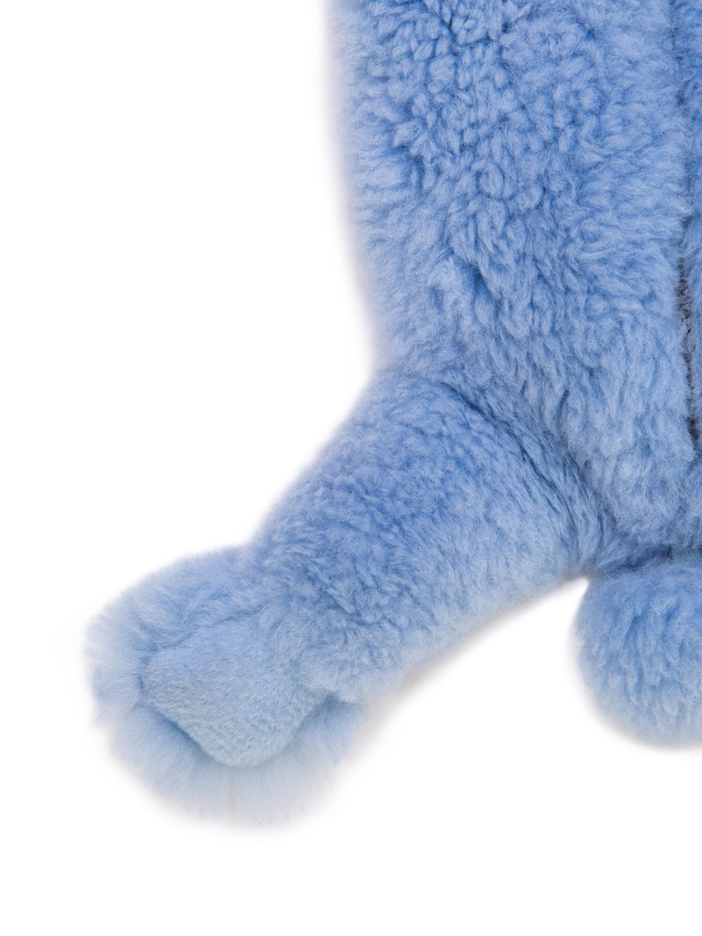 RICK OWENS HUN FAT BUNNY IN POWDER BLUE FEATURES A NUTRIA FUR BODY, ONE EYE, ONE NOSE, TWO TEETH, LONG EARS, A SECRET ZIPPER POCKET ON THE BACK AND A DETACHABLE THIN SHOULDER STRAP. IT ALSO HAS THE FEATURE OF A SMALL BAG.
