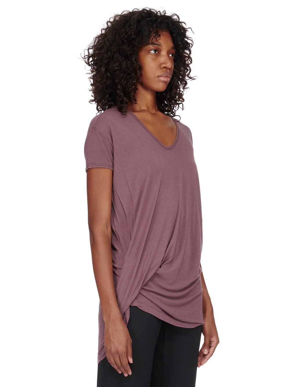 THIS HIKED T IS BELOW HIP LENGTH WITH A LOOSE FIT. IT HAS A SOFT V NECK, SHORT SLEEVES, AND A SINGLE SEAM RUNNING DOWN THE CENTRE BACK SPINE. IT FEATURES A PINCHED FOLD ON THE RIGHT HIP CREATING DRAPING AND AN ASYMMETRICAL HEMLINE.